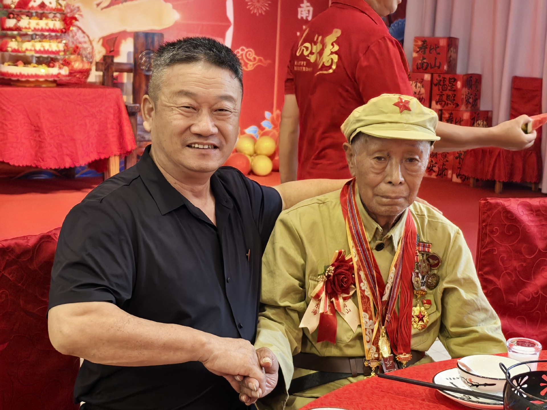 寿宴期间,一道道精心准备的菜肴陆续上桌,每一道菜都蕴含着美好的寓意——“福寿绵长”的长寿面、“吉祥如意”的清蒸鱼、“团团圆圆”的丸子……亲友与嘉宾们一边品尝美食,一边交流着对老英雄的敬佩之情,分享着家庭和睦的幸福点滴。现场不时响起欢快的笑声与真挚的祝福,喜庆的氛围感染着每一个人。