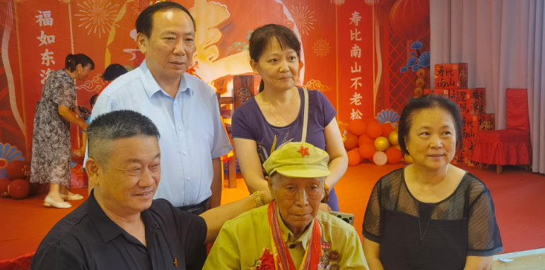 江西省健康产业协会秘书长蔡进彰、顾问胡小红、办公室主任熊艳青、江西一路有你公益服务中心党支部书记毛小宝一行参加老英雄的百岁寿诞。
