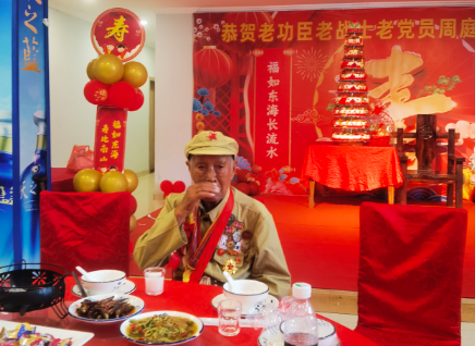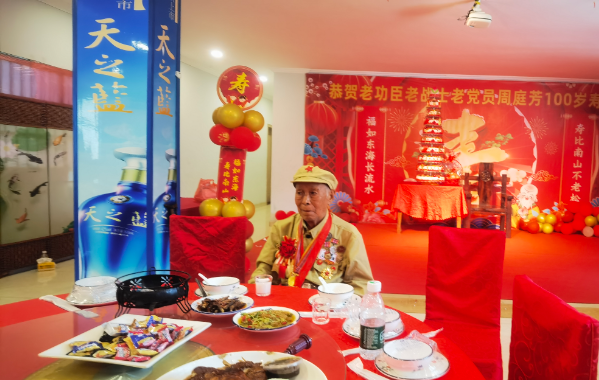 步入酒店二楼宴会厅,温馨庄重的氛围扑面而来。寿席整齐摆放,红色的桌布与点缀其间的鲜花相映成趣,处处洋溢着寿宴的喜庆。宴会厅中央,百岁老英雄周庭芳端坐于主位,身着整洁的衣物,虽已至百岁高龄,却依旧精神抖擞、目光炯炯,脸上的皱纹里镌刻着岁月的沧桑,也透着历经风雨后的从容与坚毅。舞台上方,“恭贺老功臣 老战士 老党员周庭芳100岁寿诞”的红色横幅格外醒目,每一个字都饱含着对老英雄的敬仰与祝福,瞬间将现场的情感基调定格在“致敬英雄、传承精神”的主题之上。