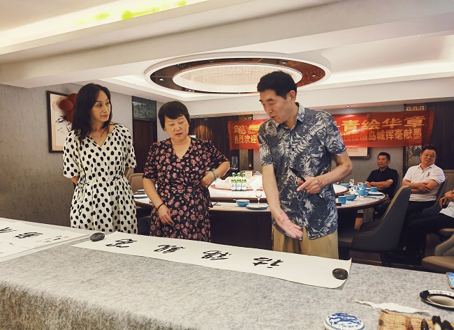 更令人动容的是,著名文物学家、珠宝鉴定专家董文华主任,人民日报山东分社原社长宋学春社长,健康报青岛工作站宋学智主任、著名中医专家李东涛先生等九位文化名人、专家也专程亲临现场。他们虽不是书画创作者,却以观摩者的身份,带着对历史的敬畏、对文化的热爱,静静欣赏每一幅作品的诞生。在与艺术家交流时,宋学春社长感慨道:“抗战精神是中华民族的宝贵财富,而书画艺术是传承文化的重要载体,这场笔会将二者完美结合,既让我们感受到了艺术之美,更让我们重温了初心与使命,意义非凡。”